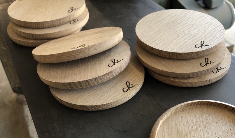 当店で製作したオーク材のグッズにブランド名を刻印しました。